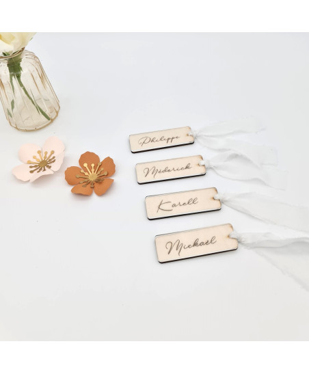 Marque place collection "Poétique" en bois de qualité (norme FSC), embelli d'un ruban mousseline, gravé au laser